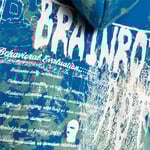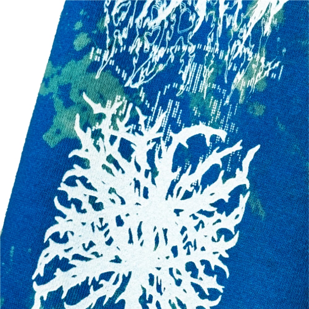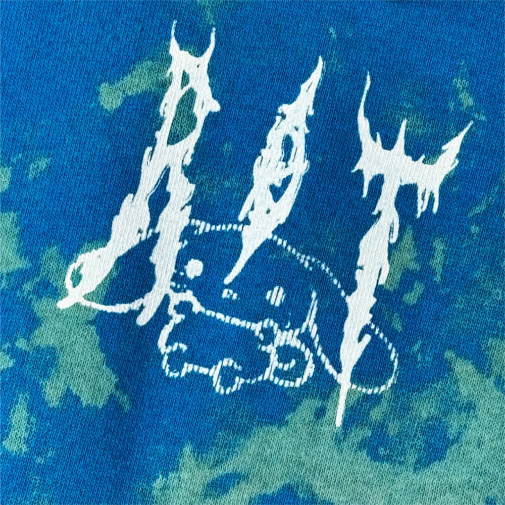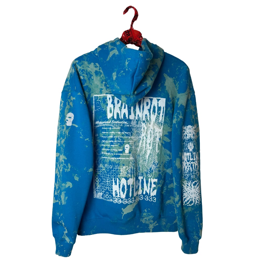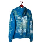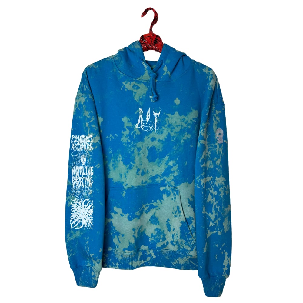 Blue and bleached hoodie, screenprinted in white. Features one embroidered balaclava detail for a subtle tactile contrast.