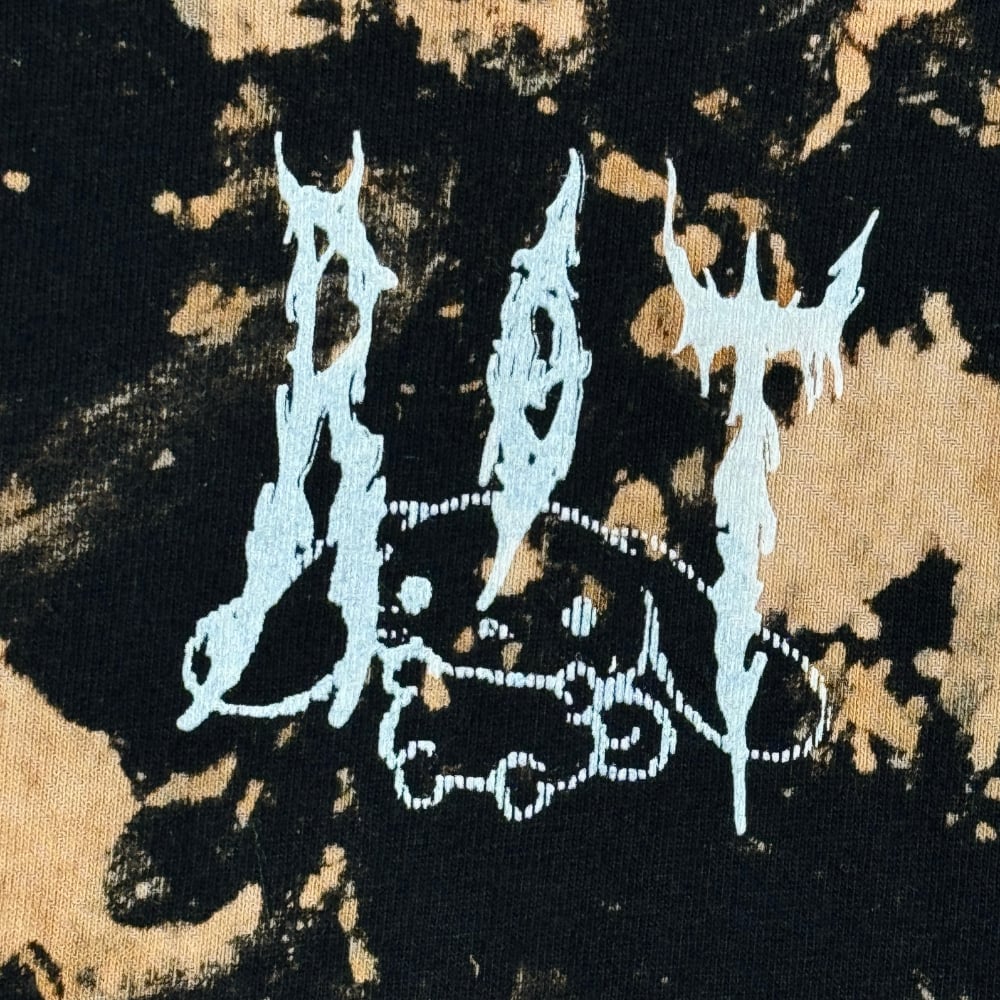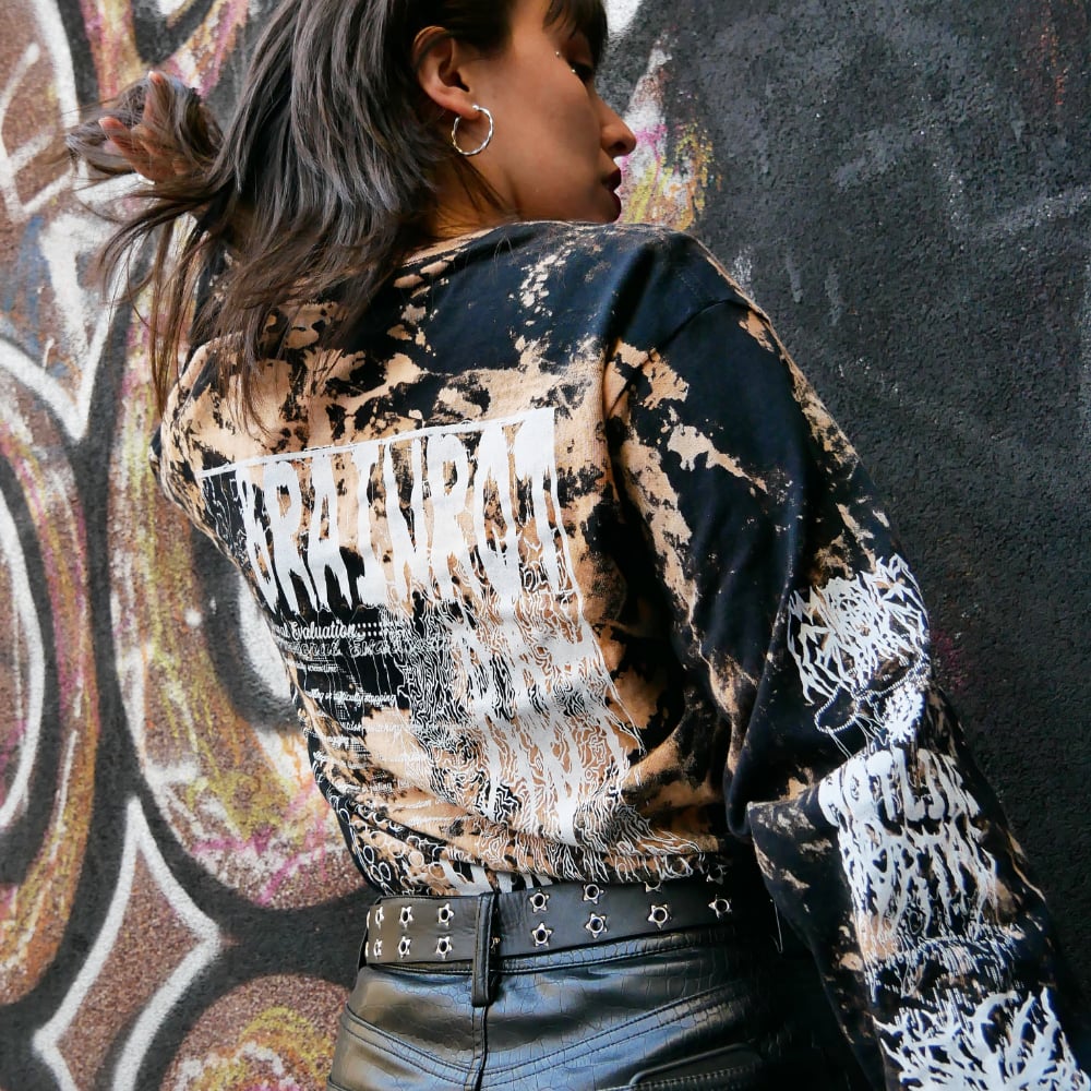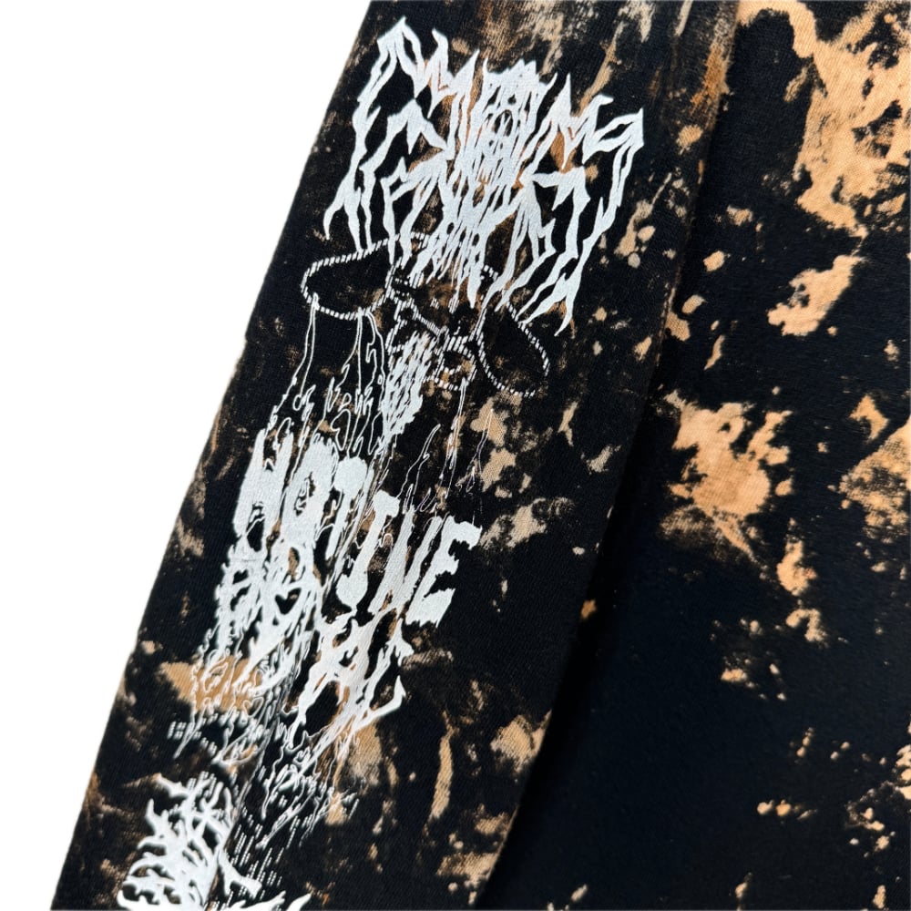 Black and bleached long sleeve t-shirt made from 100% heavy cotton, screenprinted in white. Features one embroidered balaclava detail for a subtle tactile contrast.