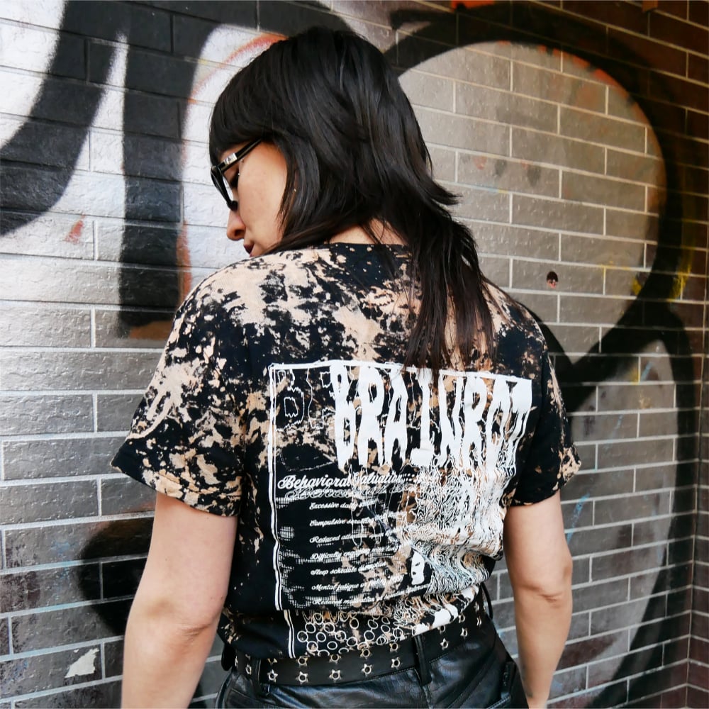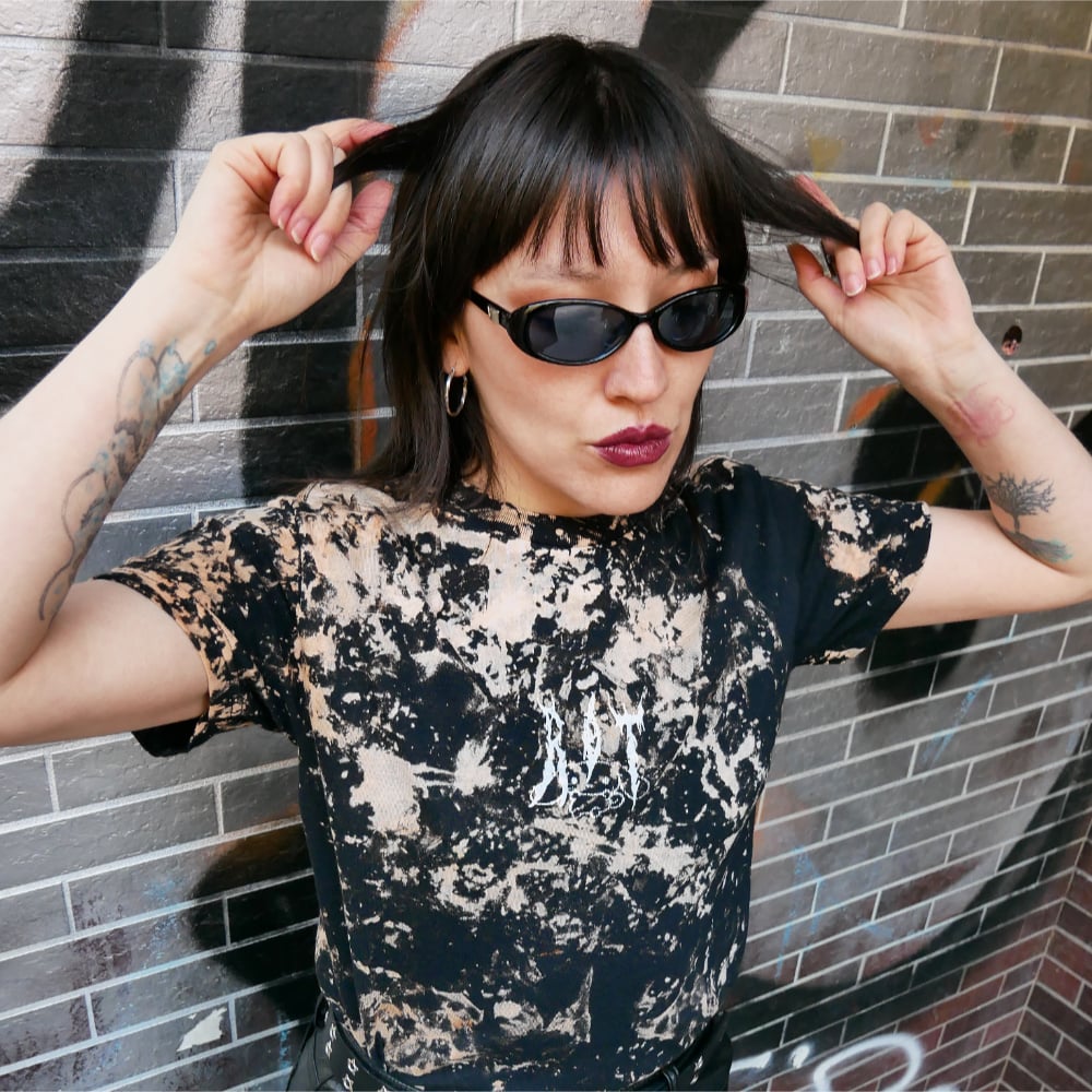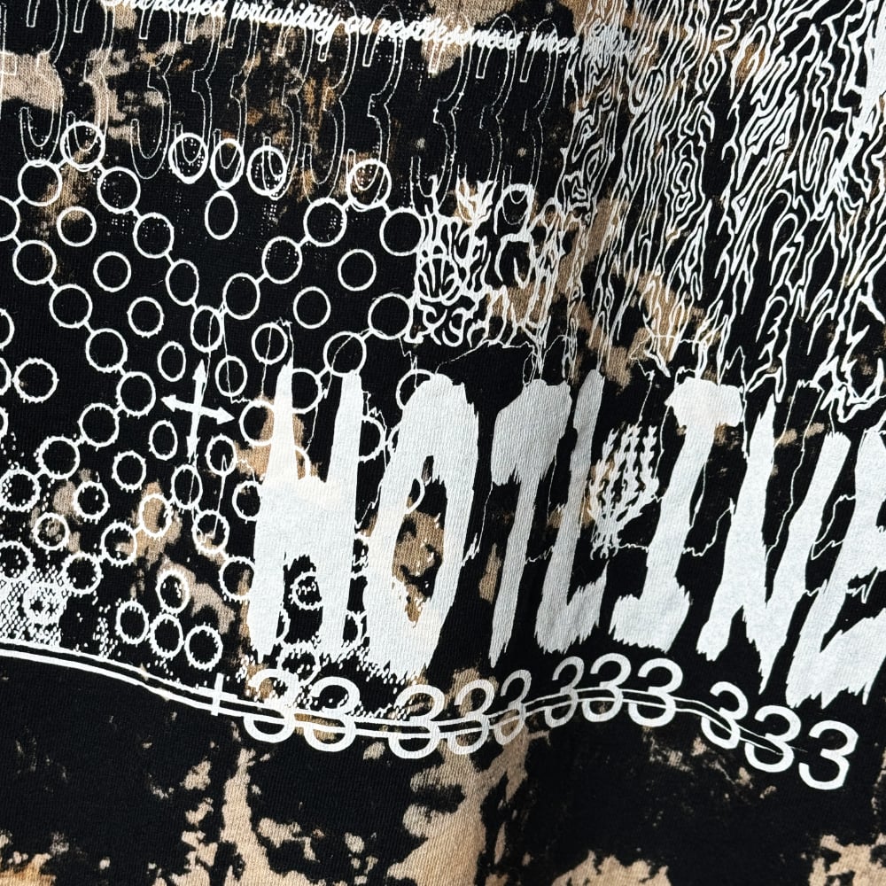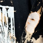 Black bleached T-shirt made from 100% heavy cotton, screenprinted in white. Features one embroidered balaclava detail for a subtle tactile contrast.