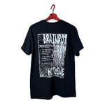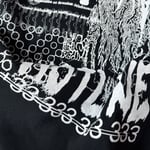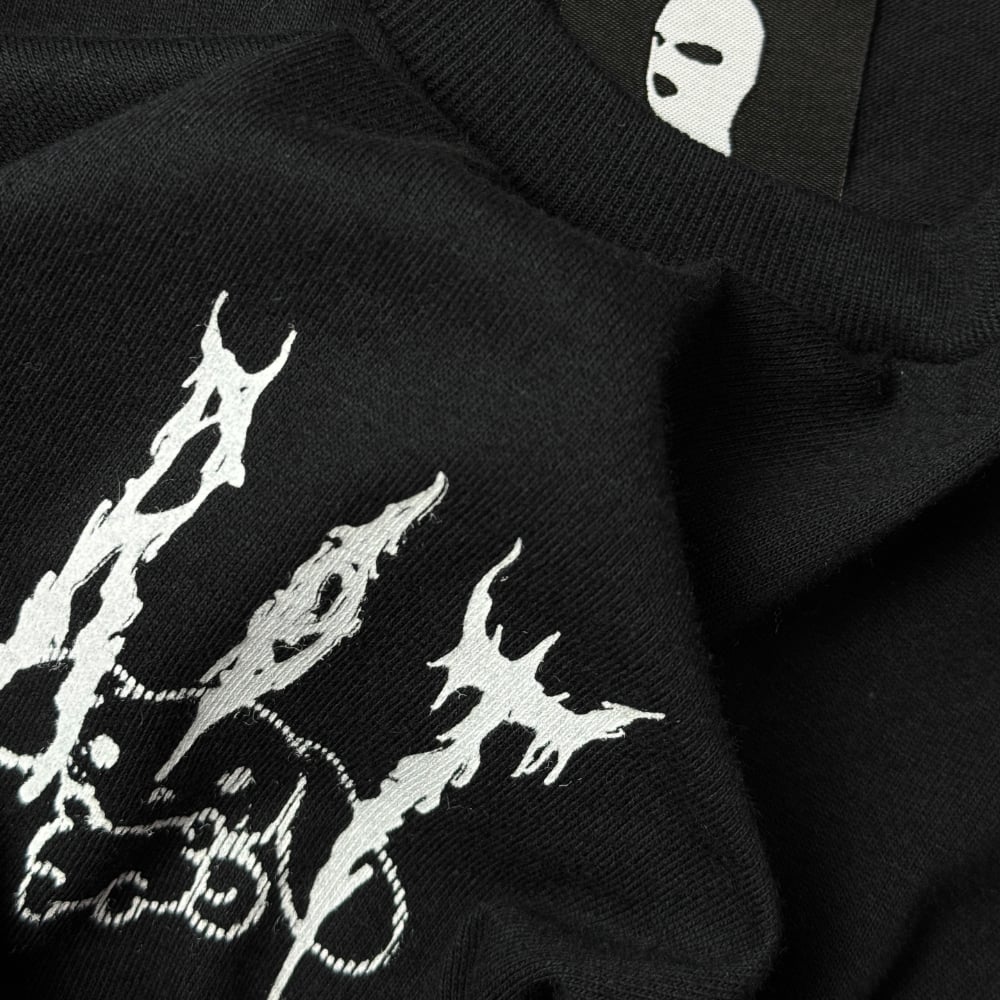 Black T-shirt made from 100% heavy cotton, screenprinted in white. Features one embroidered balaclava detail for a subtle tactile contrast.
