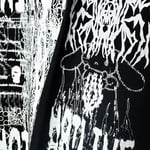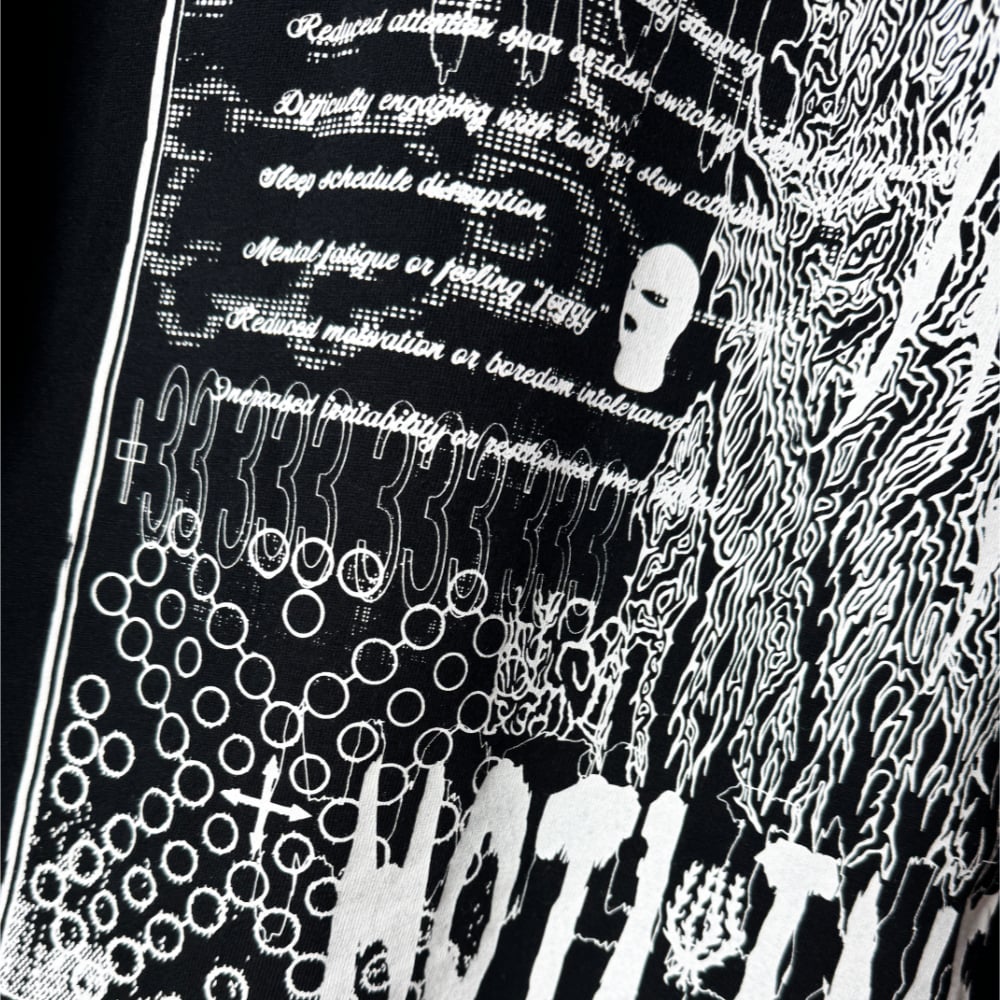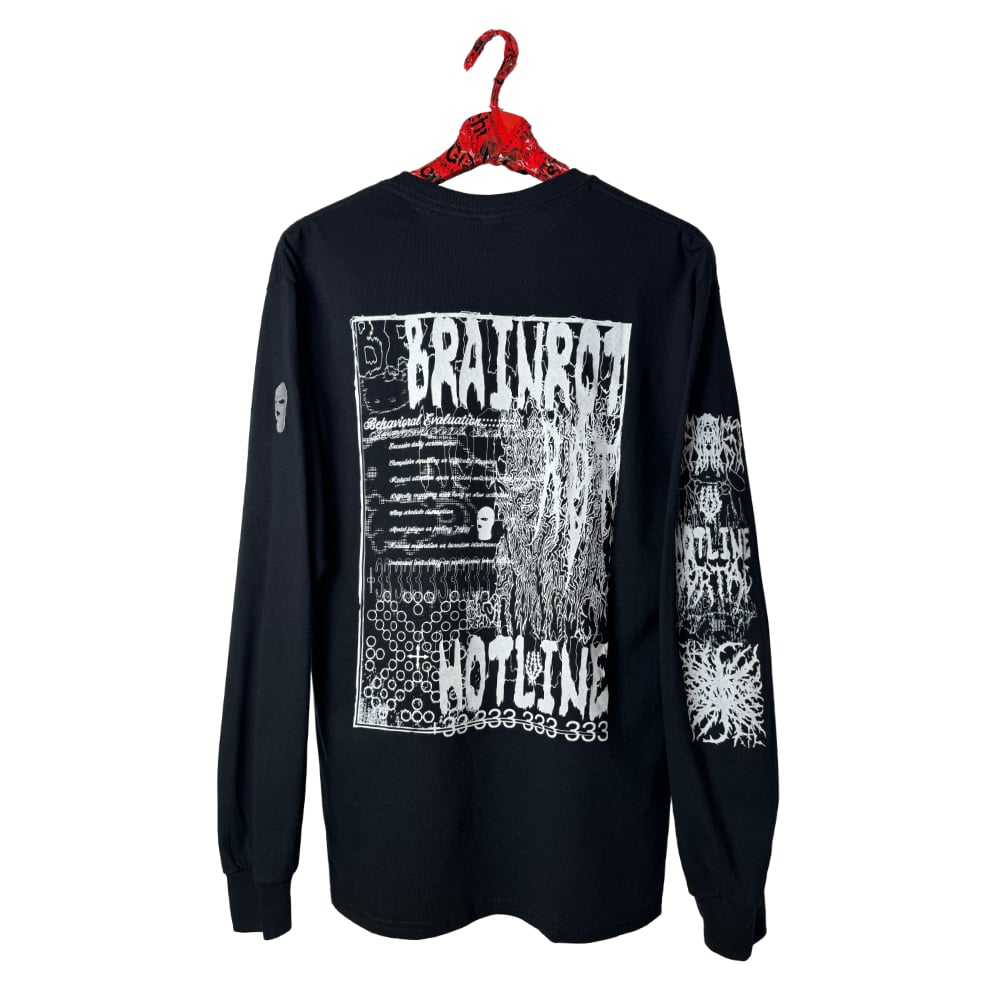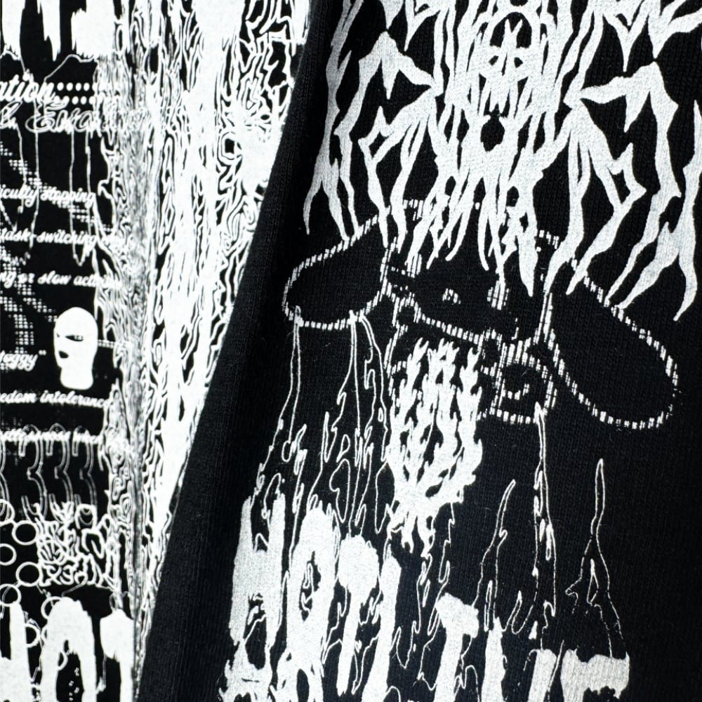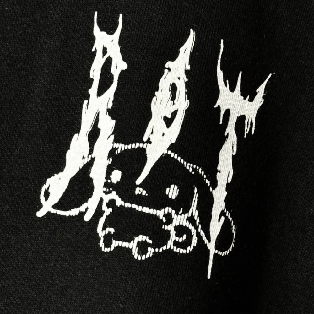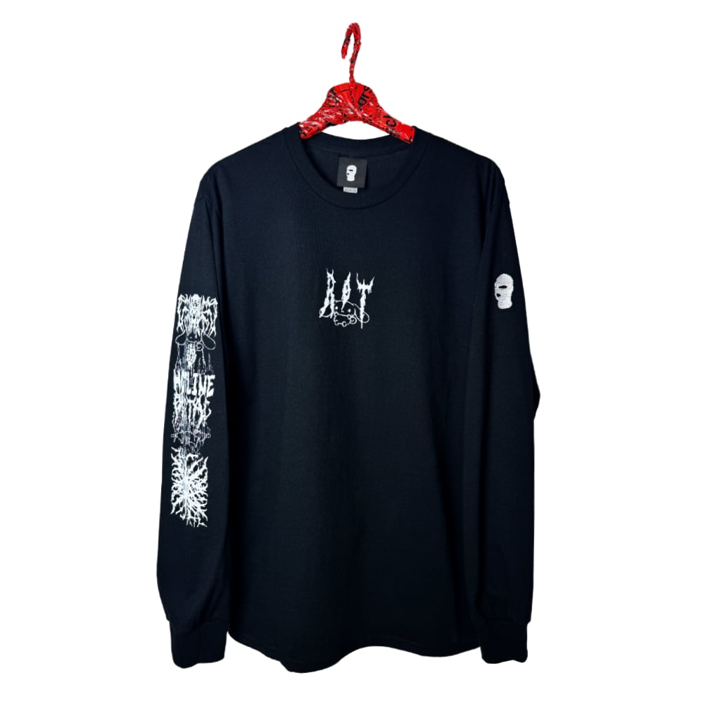Black long sleeve t-shirt made from 100% heavy cotton, screenprinted in white. Features one embroidered balaclava detail for a subtle tactile contrast.
