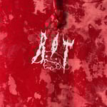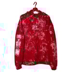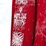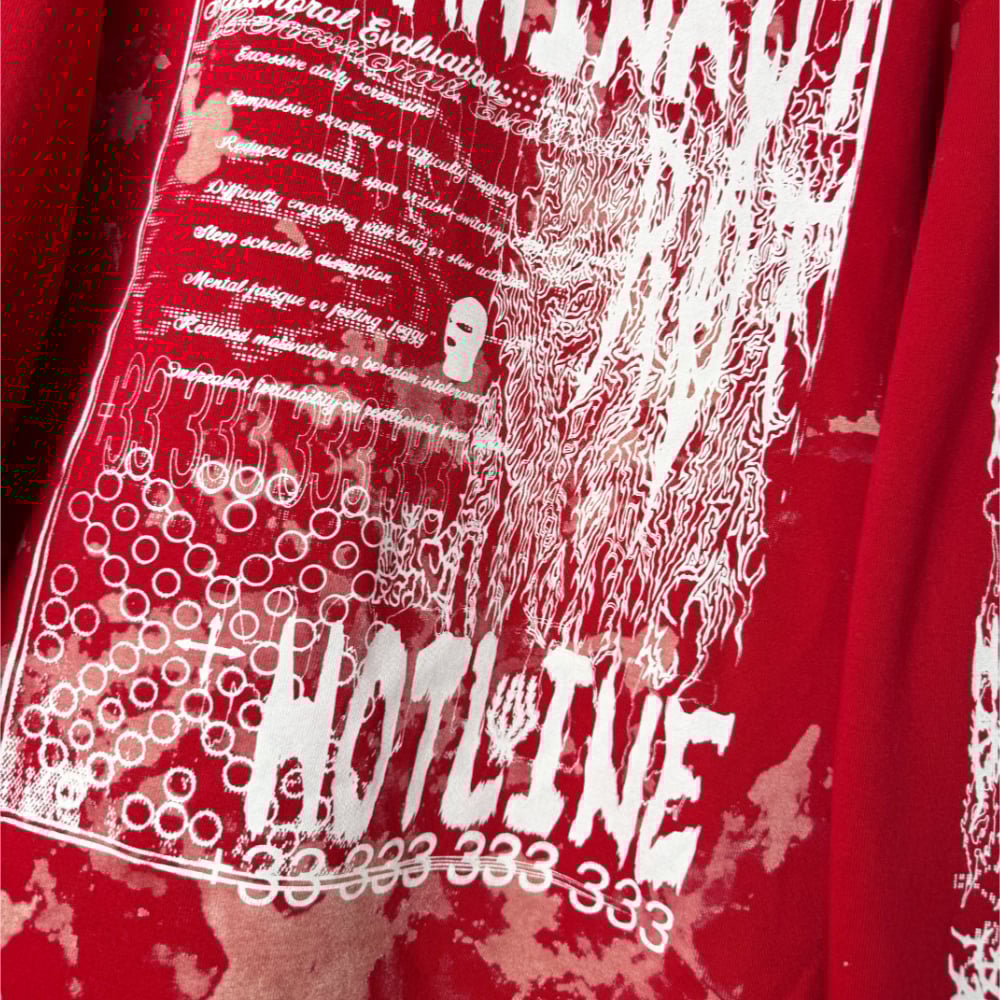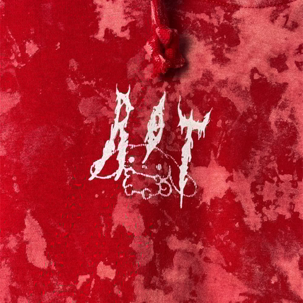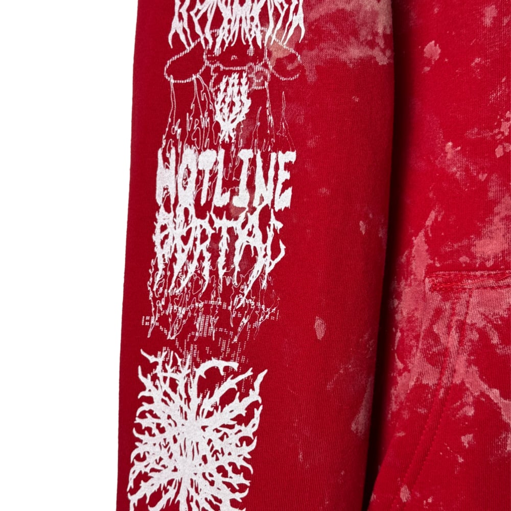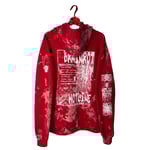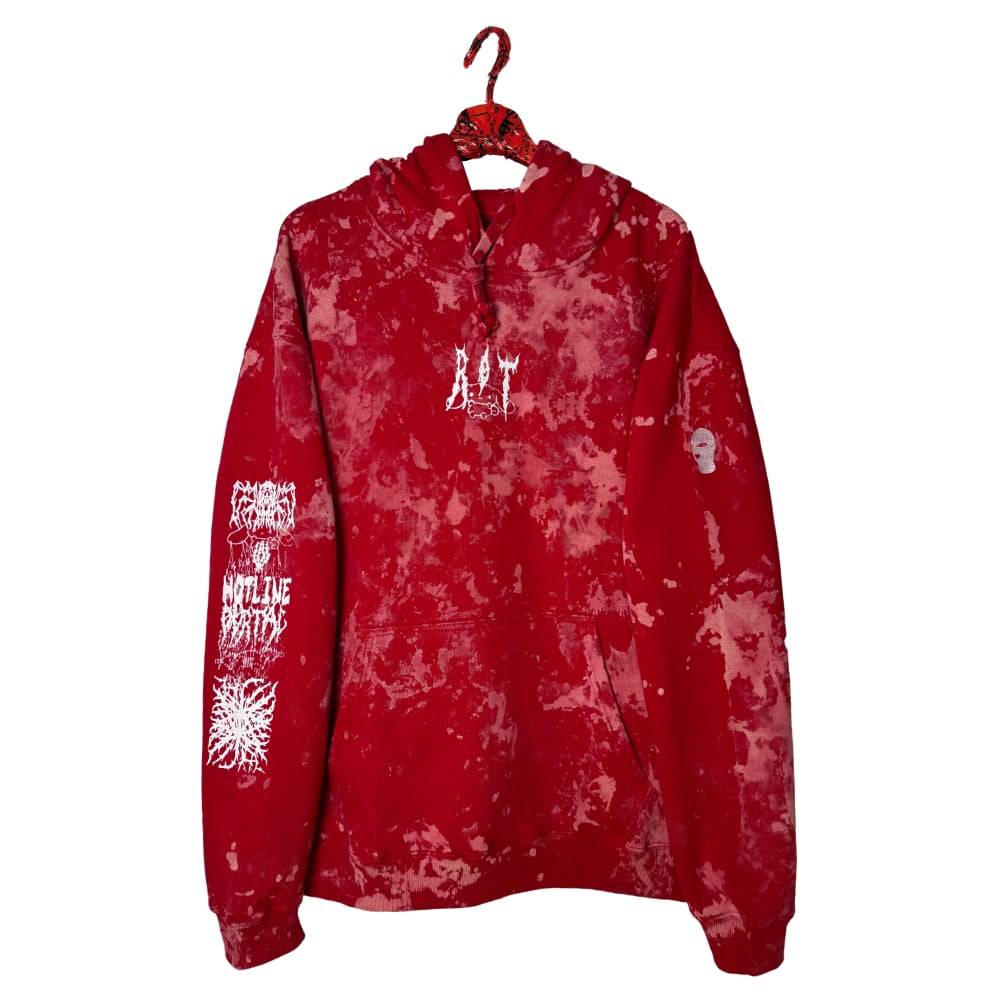 Red and bleached hoodie, screenprinted in white. Features one embroidered balaclava detail for a subtle tactile contrast.