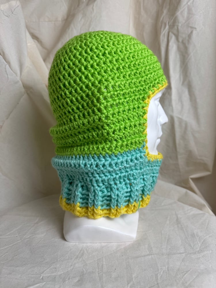 Hand-crocheted open-face balaclava made with high-quality acrylic wool.