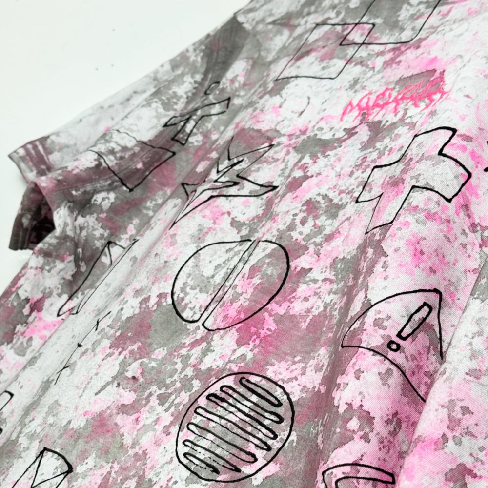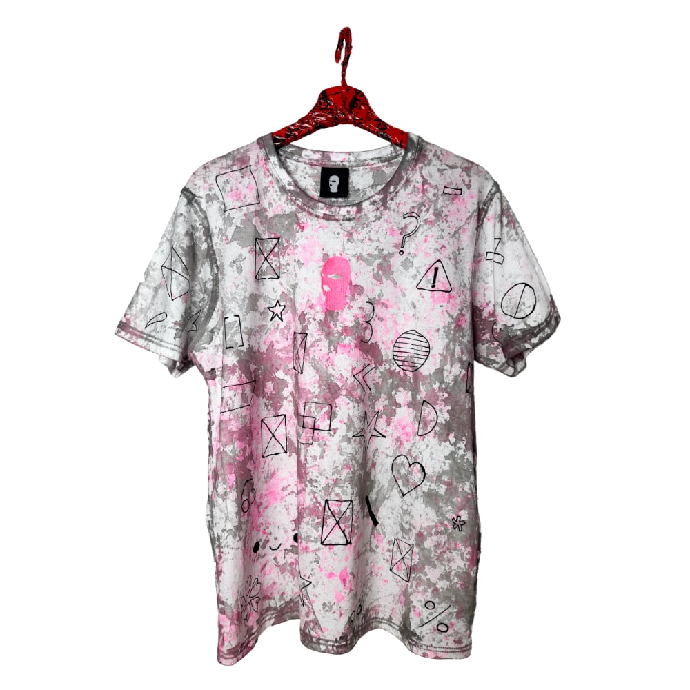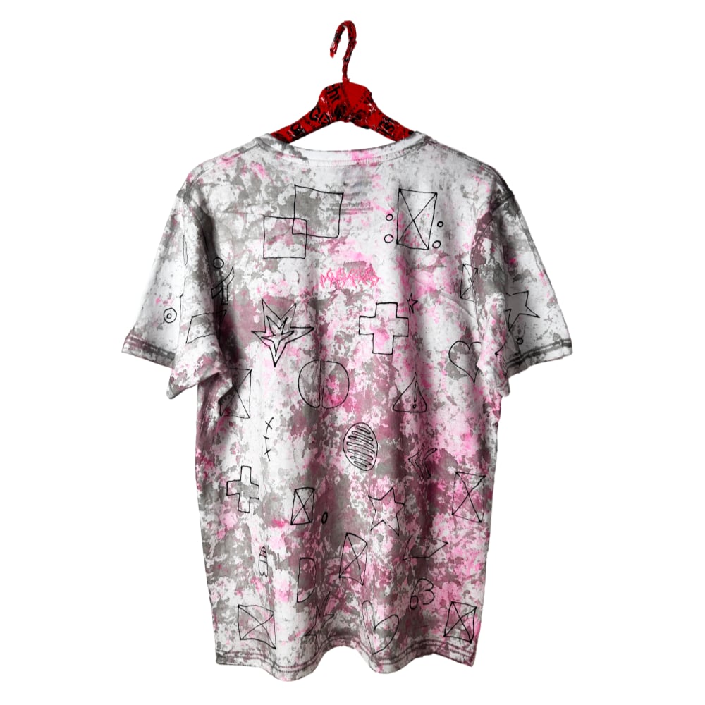 White T-shirt made from 100% cotton, stained with fabric paint and hand-drawn details using fabric marker. Each mark is part of a one-of-one composition.