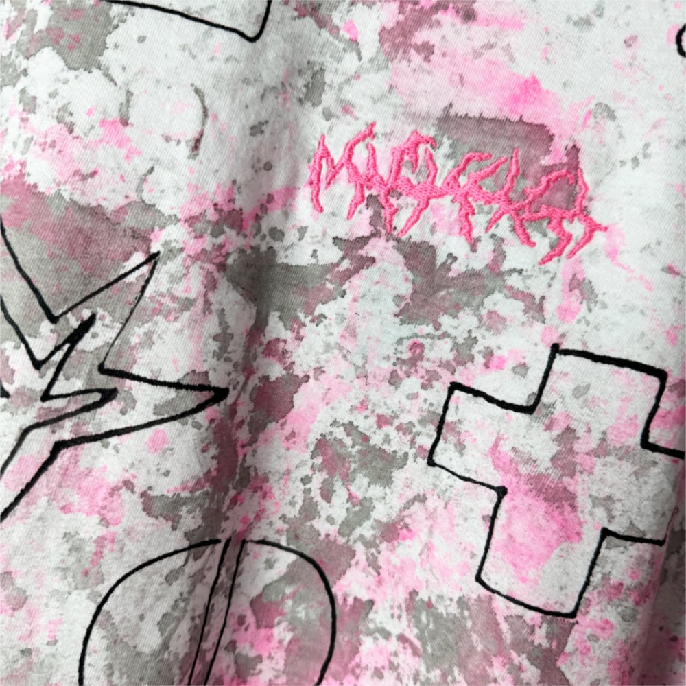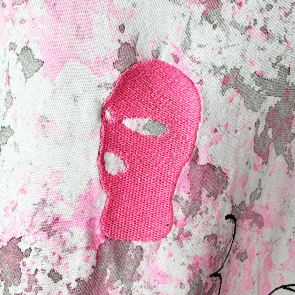 Front: Balaclava embroidery with painted and drawn interventions in neon pink, black, and white